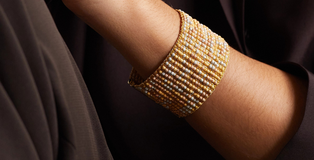 سوار ذو تصميم واسع مصنوع من الحرير. يتميز بتداخل معادن الذهب الوردي والأصفر والأبيض عيار 18 قيراطًا، ما يمنحه مظهرًا فريدًا وجمالية متميزة.