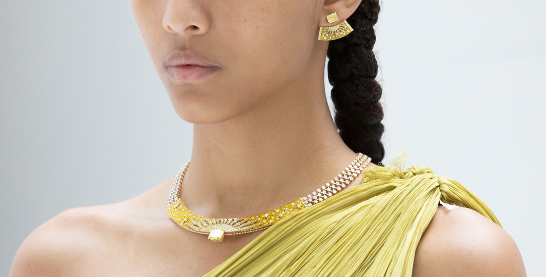 اندمجت مجموعة استثنائية من الألماسات الصفراء الفاخرة في عالم المجوهرات الراقية، ويبرز هذا بوضوح في أحدث عرض لغراف، الذي يعد تحية للأحجار الغنية بالنيتروجين. يعتبر هذا العرض، المسمى بـ”شروق الشمس”، تكريماً لألماس غراف الأصفر، وهو يتألف من مجموعة ومعرض أقيم في المتجر الرئيسي لغراف في باريس خلال هذا الصيف. المعرض يضم كنزًا استثنائيًا: ألماسة صفراء ذات قطع كمثري تزن 30 قيراطًا، لا مثيل لها، بجانب 138 قيراطًا من الألماس الأصفر والذهبي والألماس الأبيض في قلادة متفردة. وعلى الرغم من تميز هذه القطعة “البطلة”، فإن العديد من تصميمات الألماس الصفراء الأخرى في العرض لا تقل أهمية، كلها تتمتع بنفس الغنى اللوني والفخامة التي تشتهر بها تصاميم غراف.
