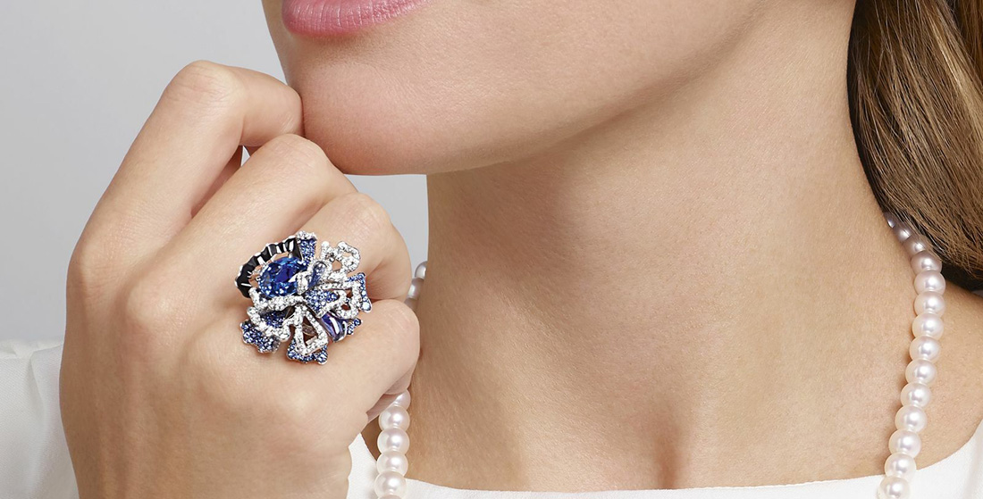 خاتم من دار شوميه يتميز بتصميمه الفريد والأنيق المستوحى من الأشكال الطبيعية، مصنوع من الذهب الأبيض ومرصع بالماس والأحجار الكريمة الزرقاء مثل الياقوت، إلى جانب تفاصيل مميزة بتقنية الطلاء باللون الأسود والأزرق التي تضيف له لمسة فاخرة وجذابة.