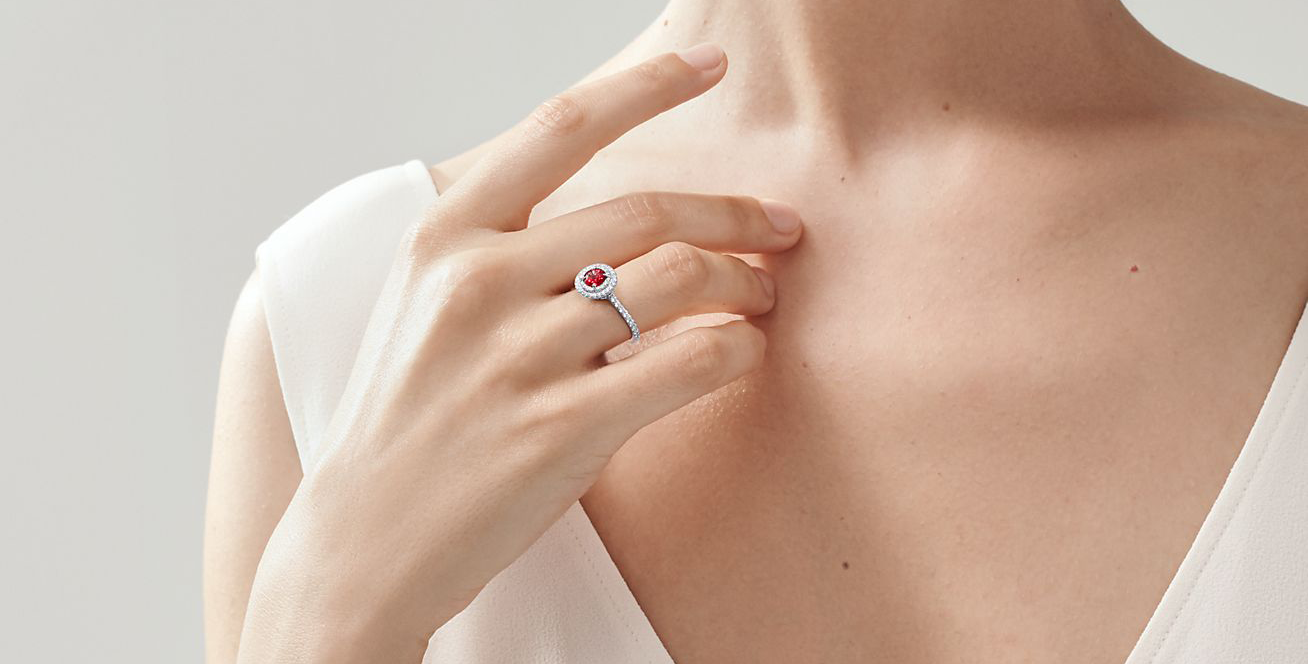 لمن ترغب بمظهر أكثر جرأة وفخامة، فإن الخواتم المصنوعة من البلاتين أو الذهب الأبيض والمرصّعة بحجر ياقوت أحمر ذي حجم أكبر، تشكّل تحفاً مركزية لا تُضاهى. تضفي القاعدة المعدنية الفاخرة هيبة استثنائية على الحجر، فيما يمكنك الاختيار من أشكال القطع المتنوّعة، كالبيضاوي أو المستدير أو المربّع. ومن هذه القطع اللافتة خاتم Ring من تيفاني آند كو، المصنوع من البلاتين ومرصّع بحجر ياقوت أحمر مستدير بوزن 0.50 قيراط، ومزيّن بما يجاوره من ألماس مستدير بوزن 0.36 قيراط، ليعبّر عن مزيج من الرقيّ والكلاسيكية.