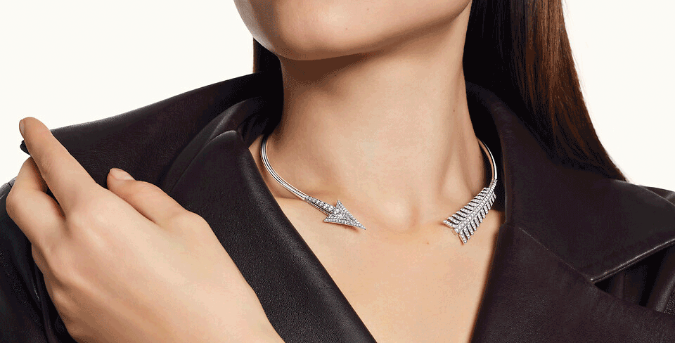 يأتي عقد Flèche من بوشرون Boucheron بتصميم أخّاذ؛ إذ صُنع من الذهب الأبيض عيار 18 قيراطاً، ورُصّع بـ203 أحجار ألماس مستديرة بوزن 2.69 قيراط.