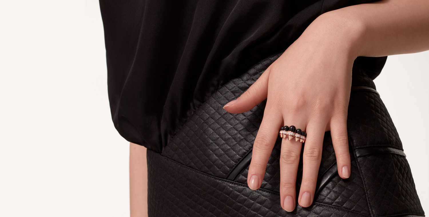 من تصميم Bulgari، وتستوحي القلادة أشكالها من رخام حمامات كاراكالا الرومانية، حيث تجمع بين الذهب الوردي والعقيق الأسود والألماس. تعكس هذه السلسلة أناقة أنثوية متجذّرة في الإرث الإيطالي.