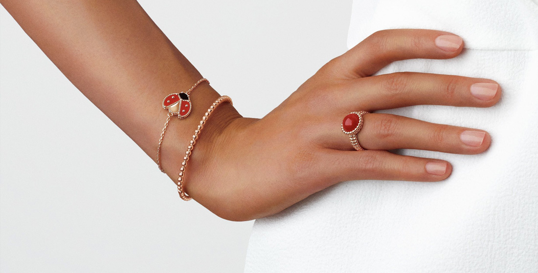 تعزز الدار هذا العام مجموعة Lucky Spring بأربع قطع جديدة: سلسلتان وخاتم وسوار. تقدم هذه المجموعة من المجوهرات صورة ربيعية نقية وأنيقة. مع لوحة نابضة بالحياة من الذهب الوردي، عرق اللؤلؤ الأبيض و العقيق. تتميز هذه القطع بزخارف دقيقة تخلق مناظر ريفية متلألئة.